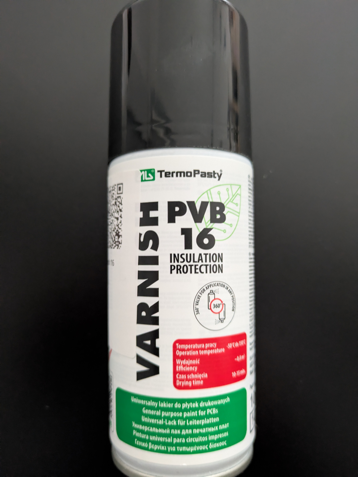 TermoPasty PVB Varnish 16 este un lac izolator pe baza de polivinil butiral, destinat protejarii placilor de circuit imprimat si a componentelor electronice. Forma sa de aerosol de 100ml permite o aplicare uniforma, inclusiv in zone greu accesibile, datorita valvei 360°. Dupa uscare, formeaza un strat transparent si flexibil, rezistent la umezeala, praf si agenti chimici. Este ideal pentru aplicatii in domeniile auto, energetic si electrotehnic.