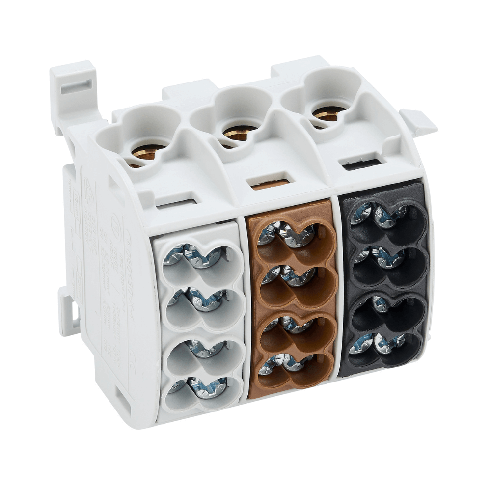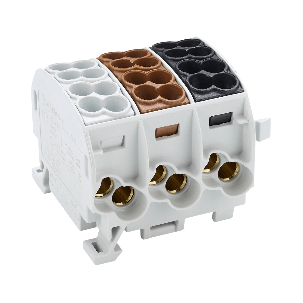 Acest bloc de distributie tripolar ofera o solutie robusta si eficienta pentru gestionarea sistemelor trifazate, dispunand de cate 2 intrari si 2 iesiri pentru fiecare pol. Fata de utilizarea a trei cleme monopolare separate, modelul IK026183-X-4 reduce spatiul ocupat si timpul de instalare, oferind o carcasa izolatoare unitara care previne scurtcircuitele intre faze. Montajul se realizeaza rapid pe sina DIN de 35.0 mm, asigurand o stabilitate mecanica ridicata si o conductivitate optima pentru conductori de cupru de pana la 25.0 mmp. Este alegerea ideala pentru tablourile de distributie moderne unde siguranta, ordinea si compactitatea sunt criterii esentiale.