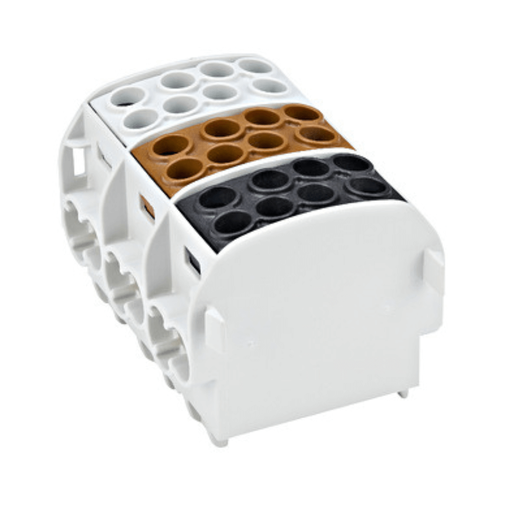 Acest bloc de distributie tripolar din seria IKA ofera o versatilitate superioara, fiind certificat pentru utilizarea mixta cu conductori de aluminiu si cupru pe toti cei trei poli. Configuratia cu 4 terminale per pol (2 intrari si 2 iesiri) faciliteaza o distributie curata pe sina DIN de 35.0 mm, eliminand nevoia de punti improvizate. Designul unitar reduce semnificativ timpul de montaj si spatiul ocupat in tablou, oferind o izolatie riguroasa care garanteaza siguranta instalatiei in orice mediu industrial sau rezidential.