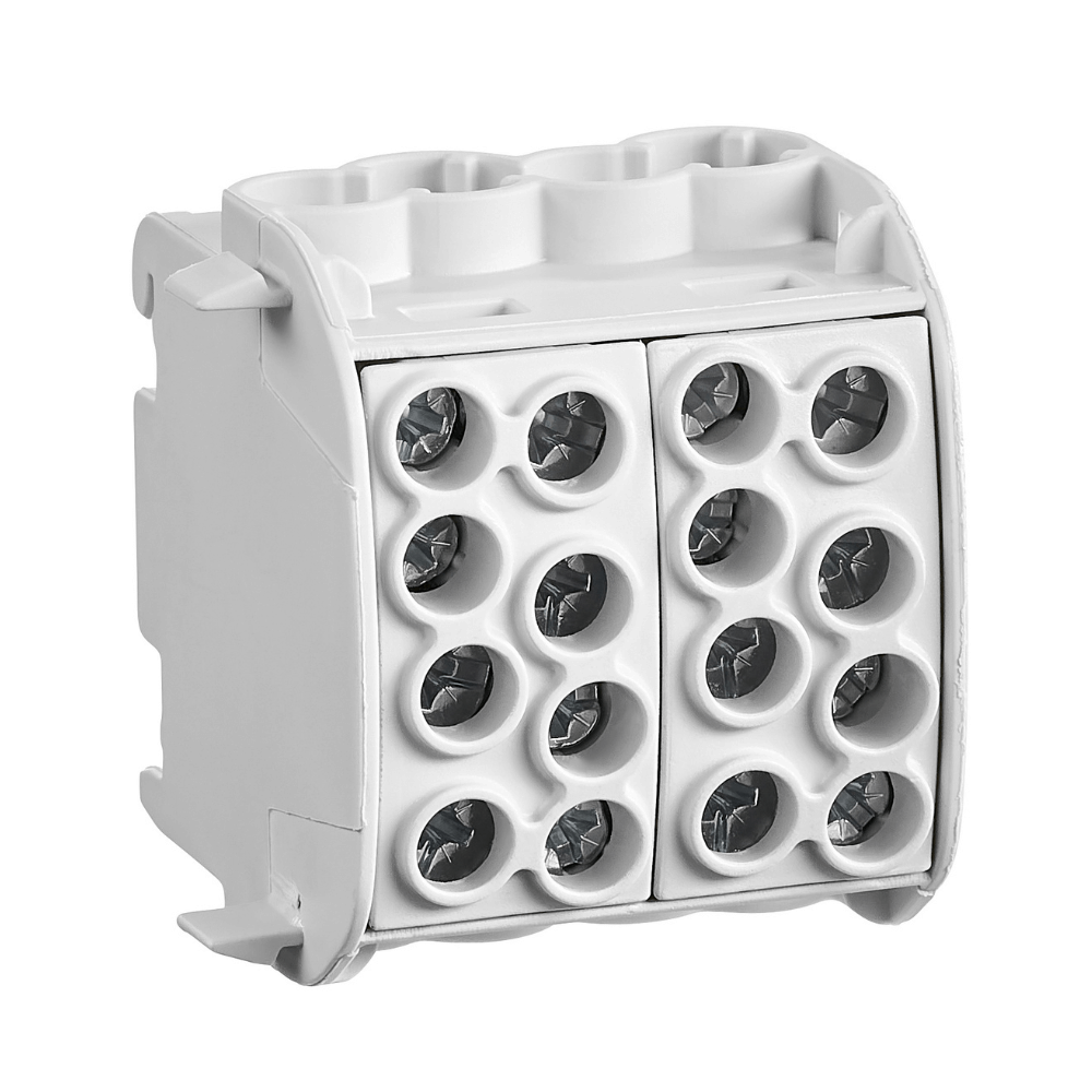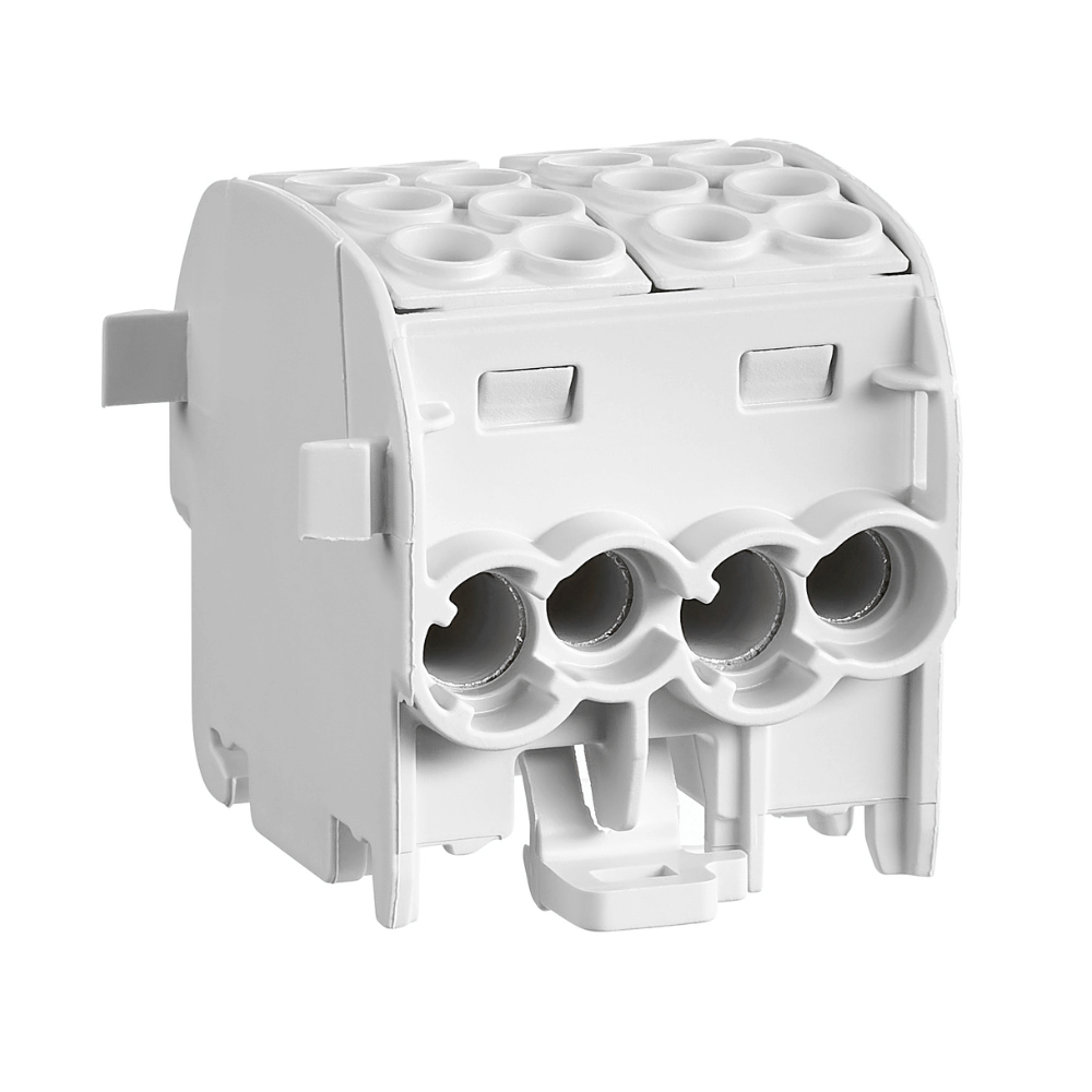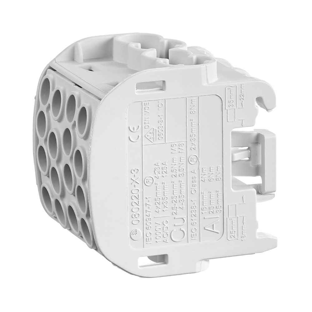 Acest bloc de distributie este certificat pentru utilizarea mixta cu conductori de aluminiu si cupru de pana la 35.0 mmp. Fata de versiunile standard care accepta doar cupru, IKA26212-X-3 ofera o flexibilitate totala in proiectare, dispunand de 4 intrari si 4 iesiri identice intr-o carcasa gri izolatoare. Montajul pe sina DIN de 35.0 mm este extrem de stabil, asigurand o organizare impecabila a cablajului si prevenind contactele accidentale. Este solutia ideala pentru tranzitia intre retelele de alimentare din aluminiu si instalatiile interioare din cupru, garantand o conexiune durabila si fara coroziune.
