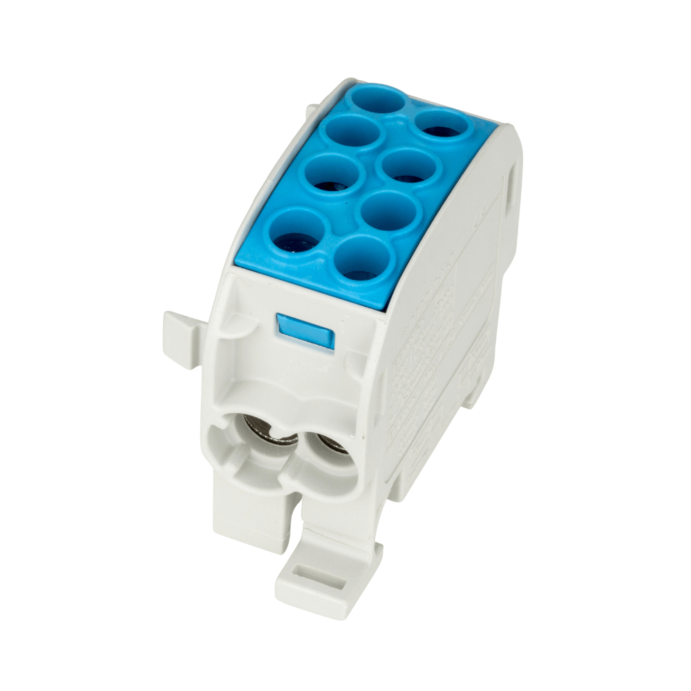 Aceasta borna de derivatie reprezinta solutia ideala pentru gestionarea nulului in instalatii care utilizeaza atat cabluri de aluminiu, cat si de cupru, oferind o configuratie eficienta de tip 2 intrari si 2 iesiri. Fata de clemele de nul standard din alama, modelul IKA26220-X-3 dispune de un corp de contact tratat special care permite imbinarea materialelor diferite fara riscul oxidarii. Carcasa albastra complet izolata respecta codurile cromatice pentru identificarea rapida a neutrului si asigura un montaj facil pe sina DIN de 35.0 mm.
