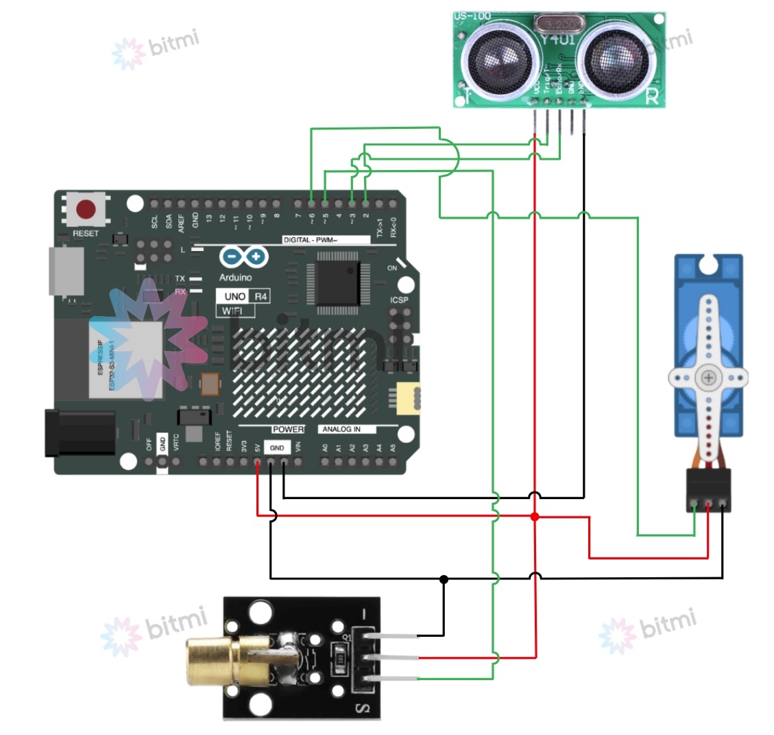 Salutare! Sunt Oana de la Bitmi.ro și astazi vreau sa iti arat cum poti construi un mic sistem de scanare cu un servomotor, un senzor ultrasonic US-100 si un laser, folosind Arduino. Este un proiect foarte distractiv si util, mai ales daca vrei sa inveti cum functioneaza senzorii cu ultrasunete si cum poti controla un servomotoarele pentru a cauta si detecta obstacole.