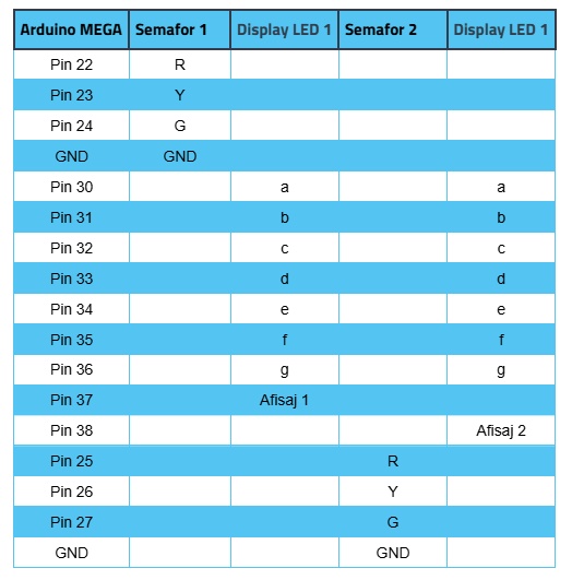 Pe langa semafoare, proiectul include si un afisaj cu o cifra pe 7 segmente, care arata secundele ramase din fiecare faza. La fiecare secunda, Arduino actualizeaza segmentele pentru a afisa numarul corespunzator, iar aceasta numaratoare este sincronizata perfect cu schimbarea culorilor semaforului. Chiar daca afisajul are doar o cifra, informatia ramane clara: cifrele scad de la timpul setat pana la 1, iar cand se termina, semafoarele trec la urmatoarea faza.