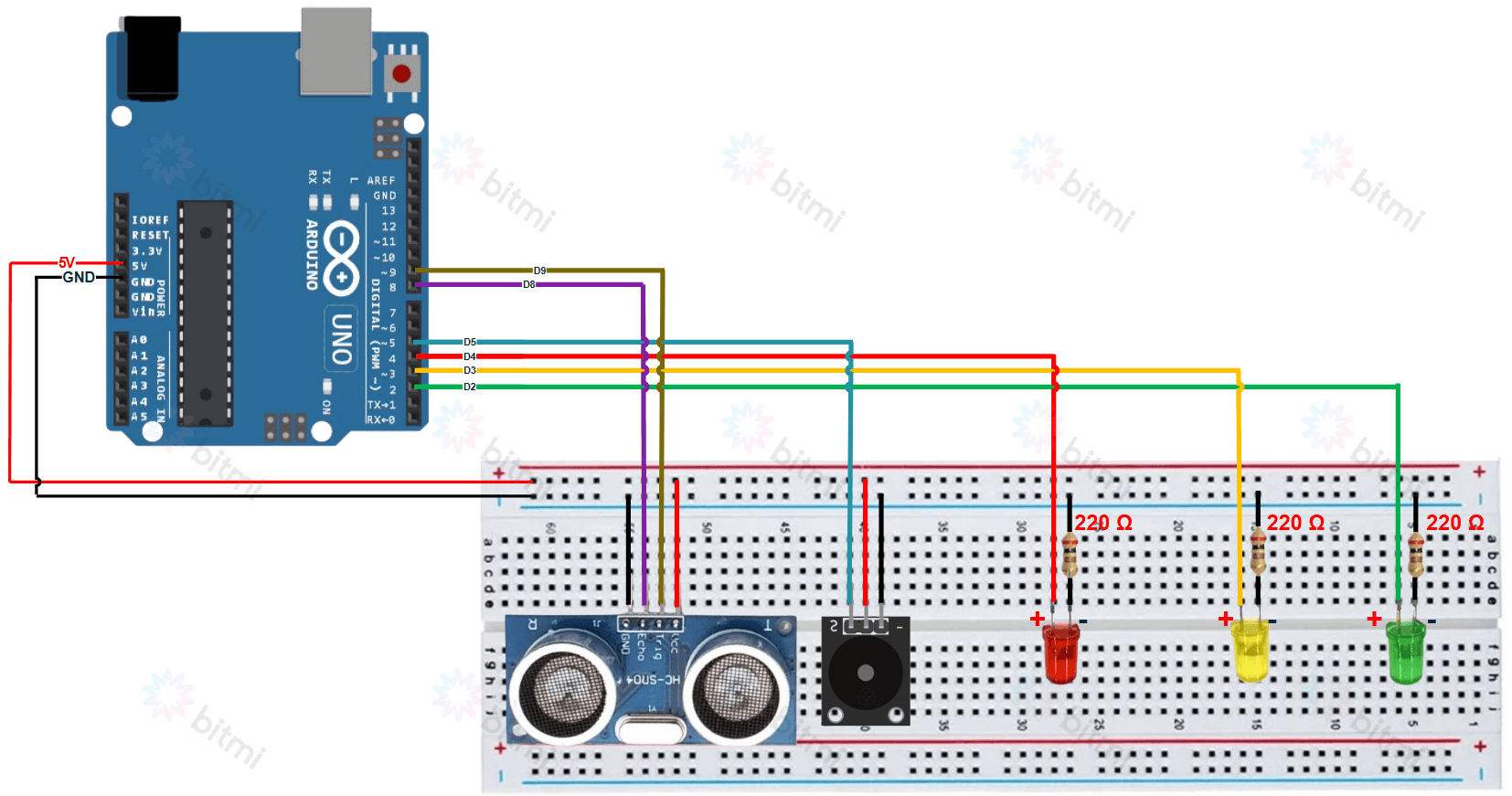 - daca obiectul este extrem de aproape (sub 5 cm), LED-ul rosu ramane aprins continuu iar buzzerul suna continuu
