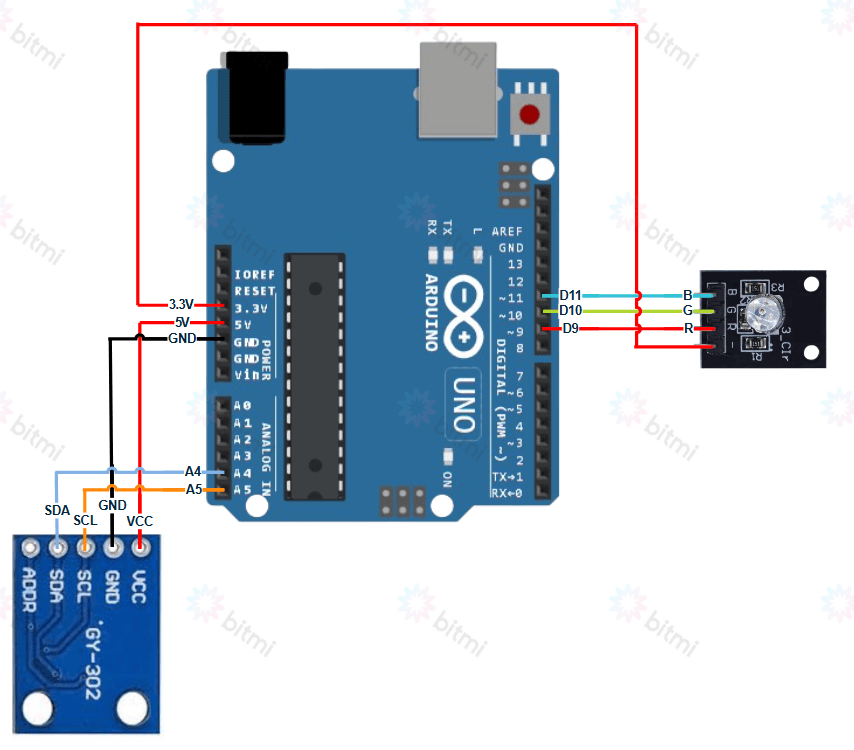 Acestea ii permit placii sa comunice cu senzorul de lumina digital GY-302 BH1750 si cu modulul LED RGB, astfel incat sa poti citi valorile de lumina si sa controlezi automat intensitatea culorilor.