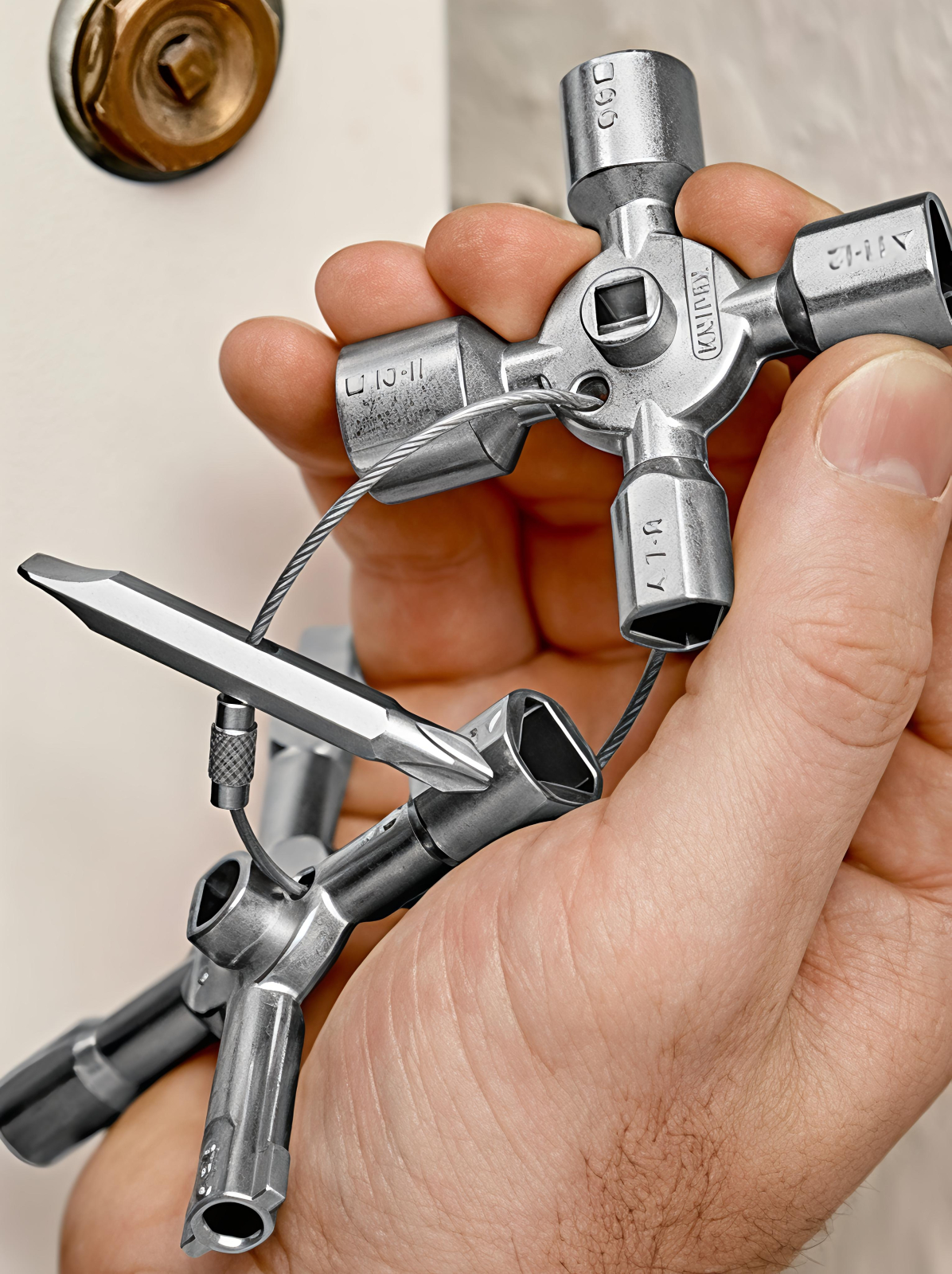 Knipex TwinKey 00 11 01 este o unealta multifunctionala pentru deschiderea si inchiderea tablourilor electrice, robinetelor, incuietorilor, supapelor de gaz si apa si sistemelor tehnice (de ex. incalzire si instalatii sanitare, sistem tehnic de climatizare si aerisire, sistem electrotehnic etc.). Este formata din doua chei tubulare cu 4 fete, care se pot roti si o surubelnita dreapta 1 x 7mm la un capat, PH2 la celalalt capat.