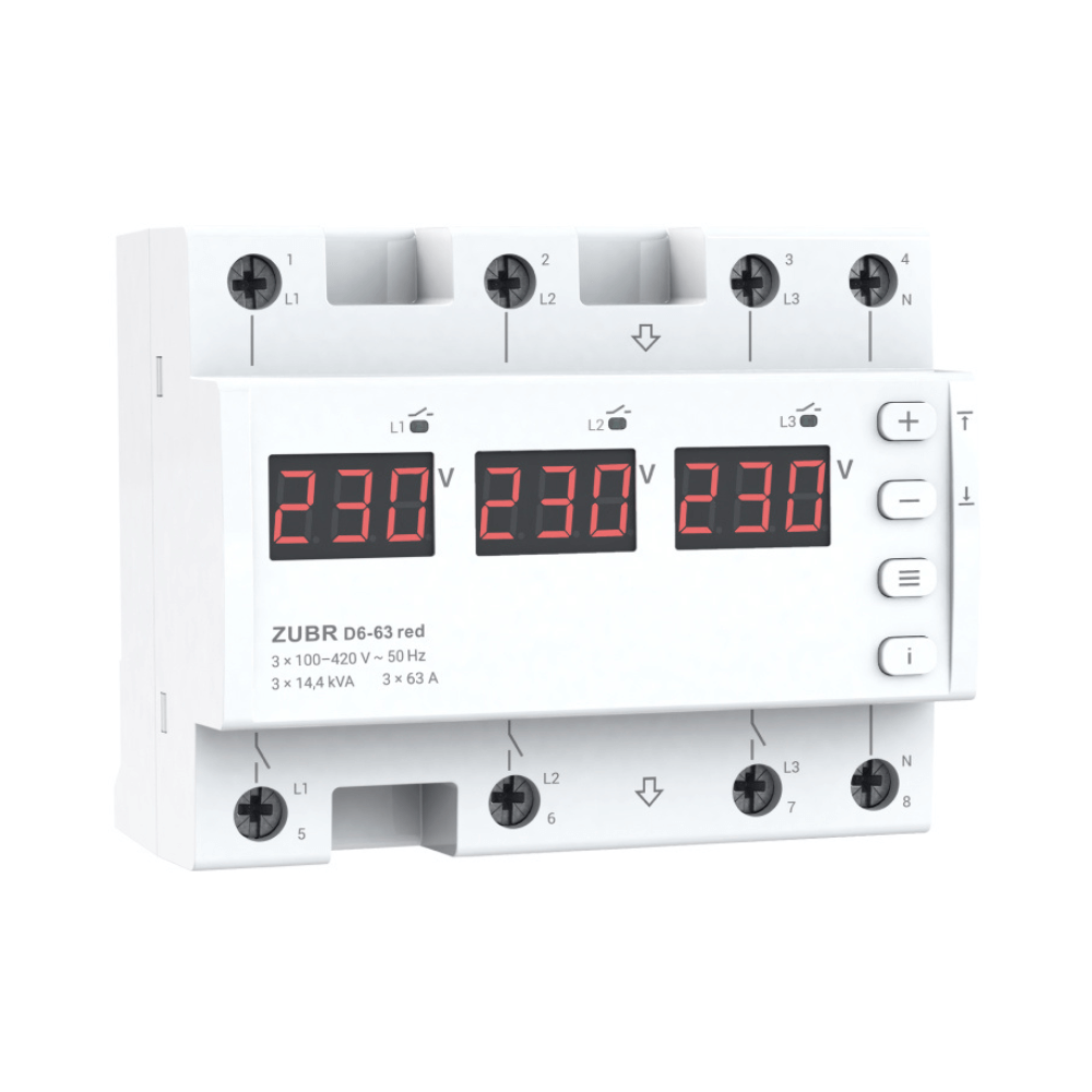 ZUBR D6-63 Red protejeaza echipamentele trifazate si monofazate prin oprirea automata a alimentarii atunci cand tensiunea depaseste sau scade sub limitele setate, sau cand apare un dezechilibru intre faze. Dispozitivul foloseste masurare precisa TrueRMS, iar protectia termica integrata ofera siguranta suplimentara. Limitele, intarzierea la reconectare si pragul de dezechilibru se pot regla usor pentru a se adapta la orice retea. Releul functioneaza in siguranta la un curent nominal de 3x63A si suporta o putere maxima de 3x13900VA. Montajul pe sina DIN este rapid, iar dimensiunile compacte economisesc spatiu in tabloul electric.