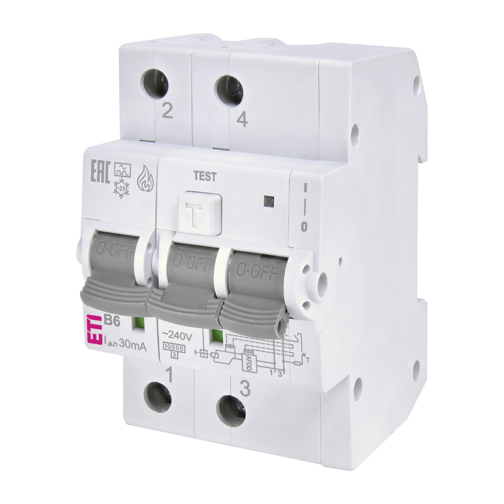 KZS-AFDD 3M2p A B6/0.03 ETI 002173811 este un dispozitiv compact care protejeaza instalatiile electrice impotriva defectelor de arc, a supracurentului si a curentilor reziduali. Functioneaza la 6 A si 30 mA, cu o capacitate de rupere de 10 kA la 240 V. Se monteaza usor pe sina DIN de 35 mm si dispune de semnalizare LED pentru verificare rapida a functionarii.