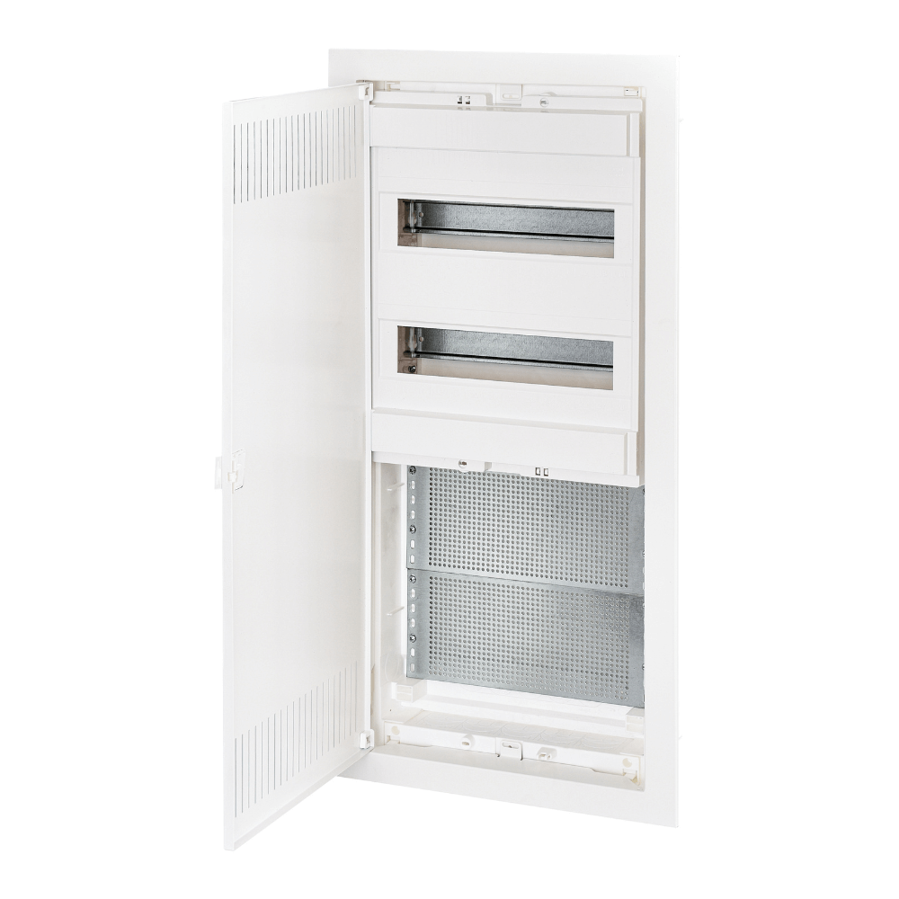 ECG56COMBO2/2-I ETI 001100222 este o cutie de distributie cu 4 randuri si 28 de module, avand grad de protectie IP30 si clasa de protectie II. Este prevazuta cu usa metalica perforata alba si baza din plastic alb, oferind o solutie sigura si practica pentru organizarea si protectia circuitelor electrice in instalatii rezidentiale sau comerciale.