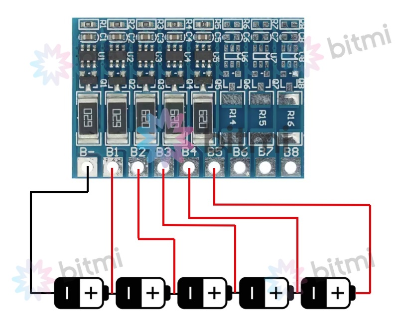 Conexiuni: B- la borna negativa a pachetului, B1-B5 intre celule, B5 la borna pozitiva