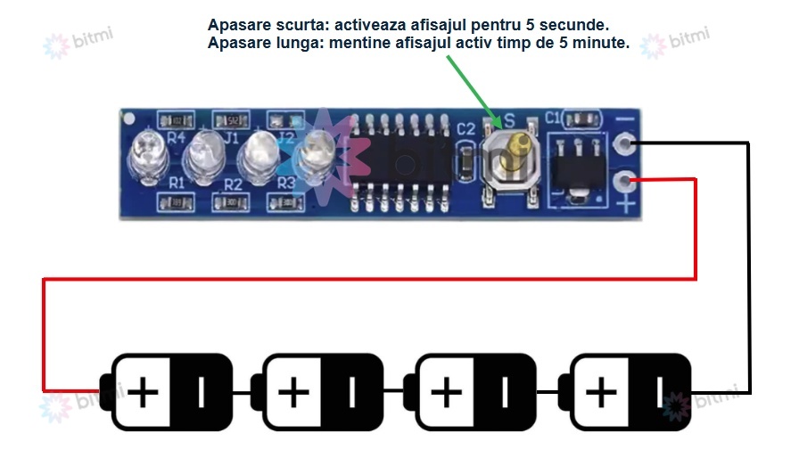 Modulul indicator nivel baterie este un instrument esential pentru monitorizarea nivelului de incarcare al bateriilor litiu 4S. Prin detectarea tensiunii curente a bateriei, modulul controleaza iluminarea a patru LED-uri pentru a indica procentul de incarcare: 1 LED aprins: 25% capacitate (aproximativ 13.6V), 2 LED-uri aprinse: 50% capacitate (aproximativ 14.4V), 3 LED-uri aprinse: 75% capacitate (aproximativ 15.2V, 4 LED-uri aprinse: 100% capacitate (aproximativ 16V). Modulul este echipat cu un buton care, la o apasare scurta, activeaza afisajul pentru 5 secunde. O apasare lunga de peste 2 secunde mentine afisajul activ timp de 5 minute. Este compatibil cu baterii litiu 4S 18650 si poate fi utilizat in diverse aplicatii, de la proiecte DIY pana la echipamente portabile.