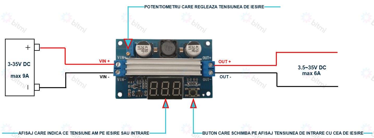Tensiune de intrare: 3-35V DC (sub 4V, voltmetrul nu functioneaza)