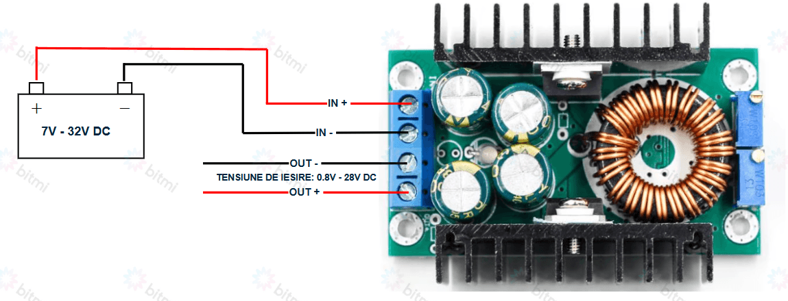 Exemplu schema conectare modul coborator de tensiune DC-DC: