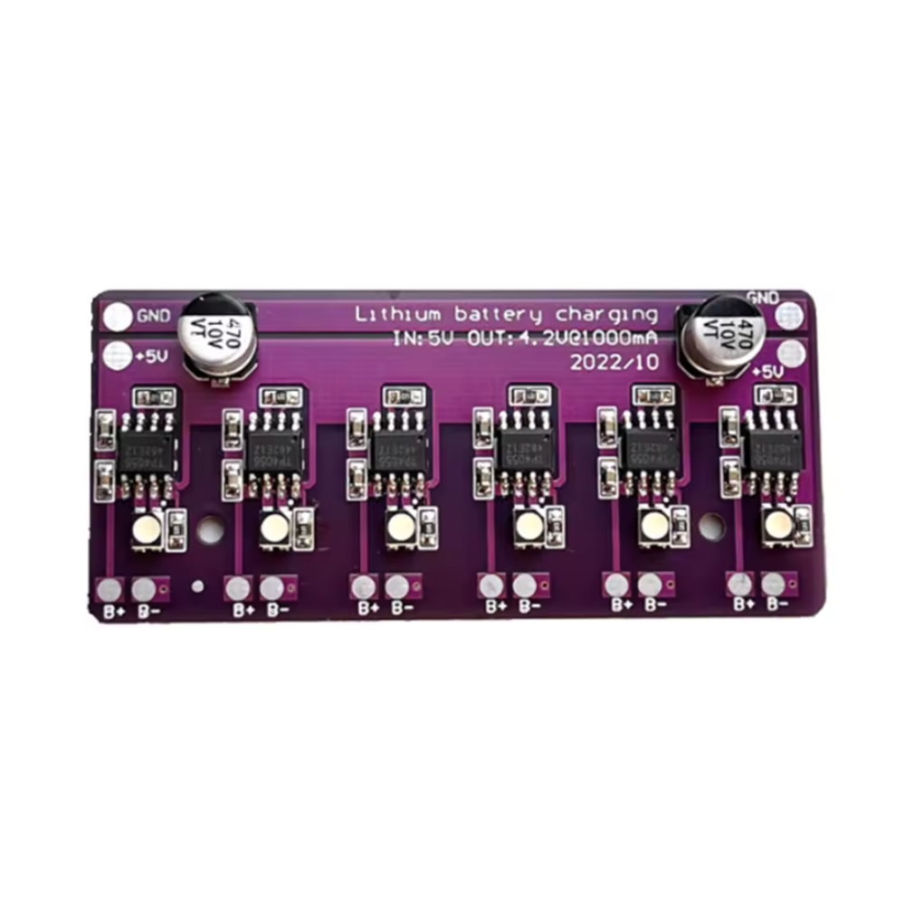 Modulul de incarcare TP4056 cu 6 canale este conceput pentru incarcarea paralela a acumulatorilor Li-ion, oferind o solutie compacta si eficienta pentru gestionarea alimentarii in proiecte electronice. Functioneaza cu o tensiune de intrare de 5V pana la 6V si furnizeaza un curent de incarcare de pana la 1A pe canal, cu tensiune de iesire stabila de 4.2V. Este echipat cu indicatori LED pentru fiecare canal: lumina rosie semnaleaza ca bateria se incarca, iar verde inseamna ca incarcarea s-a finalizat. Datorita designului paralel, poti conecta mai multe module pentru a creste curentul total, dar nu este recomandata conectarea bateriilor in serie.