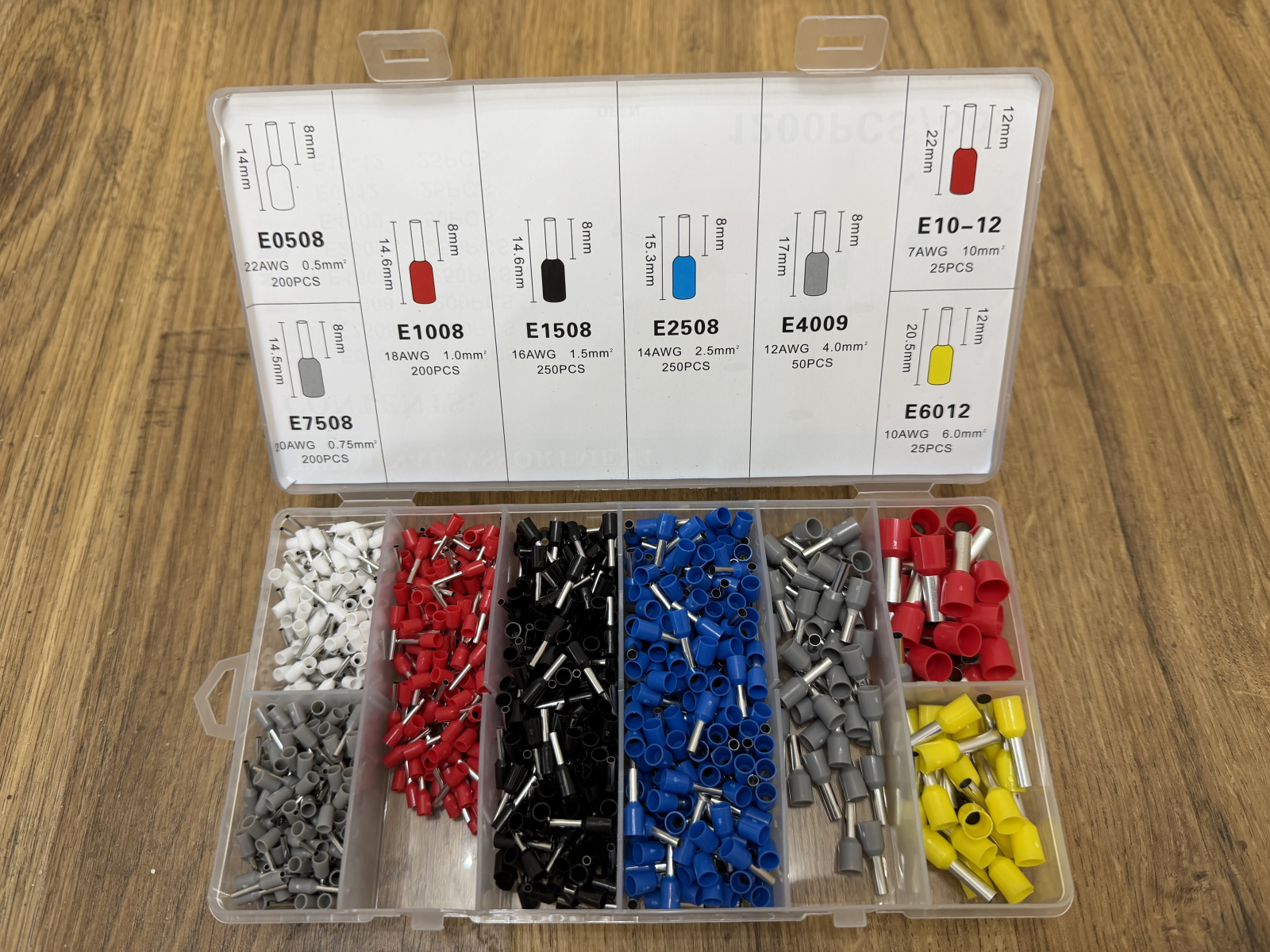 Pachetul contine 1200 bucati pini terminali izolati (terminale tubulare de capat) pentru conductori electrici. Se utilizeaza pentru sertizarea conductorilor electrici multifilari, cu ajutorul unui cleste pentru sertizare.