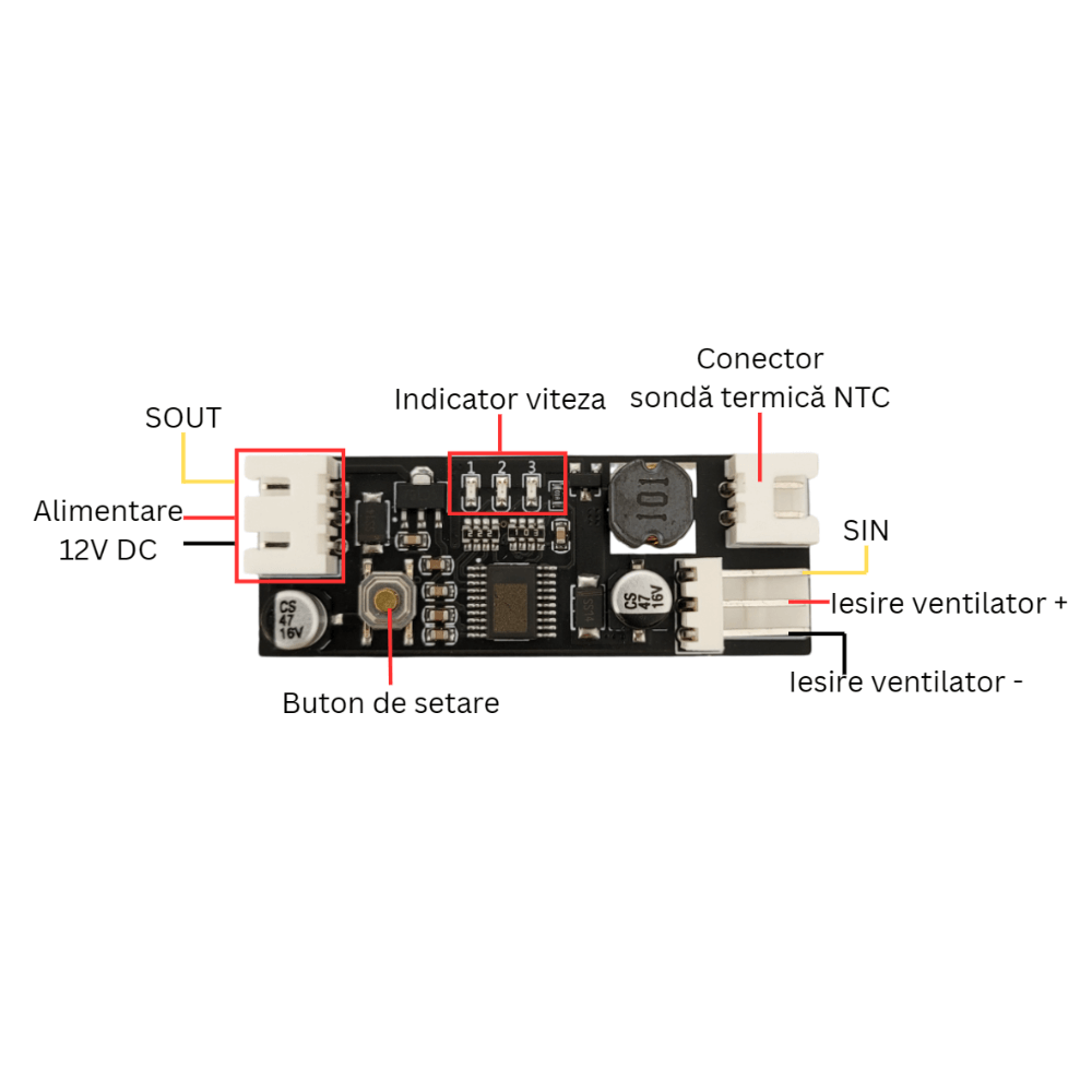 Acest modul este un dispozitiv utilizat pentru a controla viteza unui ventilator in functie de temperatura ambientala. Principala lui caracteristica este capacitatea sa de a ajusta turatatia ventilatorului prin modularea latimii de impulsuri PWM (Pulse Width Modulation). Aceasta inseamna ca tensiunea de alimentare a ventilatorului este pulsata rapid, iar durata impulsurilor determina cat de rapid sau incet se va roti ventilatorul. Prin modificarea duratei impulsurilor PWM in functie de temperatura masurata, se poate controla viteza ventilatorului. Este prevazut cu indicator LED pentru a afisa starea de functionare sau alte informatii relevante.