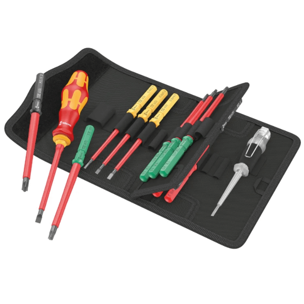 Set compact VDE cu 16 piese de la Wera, ideal pentru lucrari electrice in siguranta. Maner ergonomic Kraftform, lame interschimbabile izolate 1000V, toate intr-o husa rezistenta. Perfect pentru electricieni profesionisti sau interventii rapide.